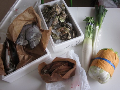 イカ2、干物7、タイ2、牡蠣14、白菜、ネギ、大根。。。